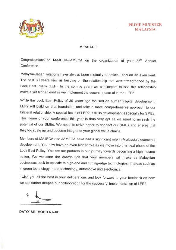 “I would like to convey my sincere congratulations to JAMECA and MAJECA on convening their 33rd joint conference, today. I would like to take this opportunity to commend both JAMECA and MAJECA once again for their contribution in strengthening the economic relations between Japan and Malaysia as a bridge between our two countries since their inception in 1977.