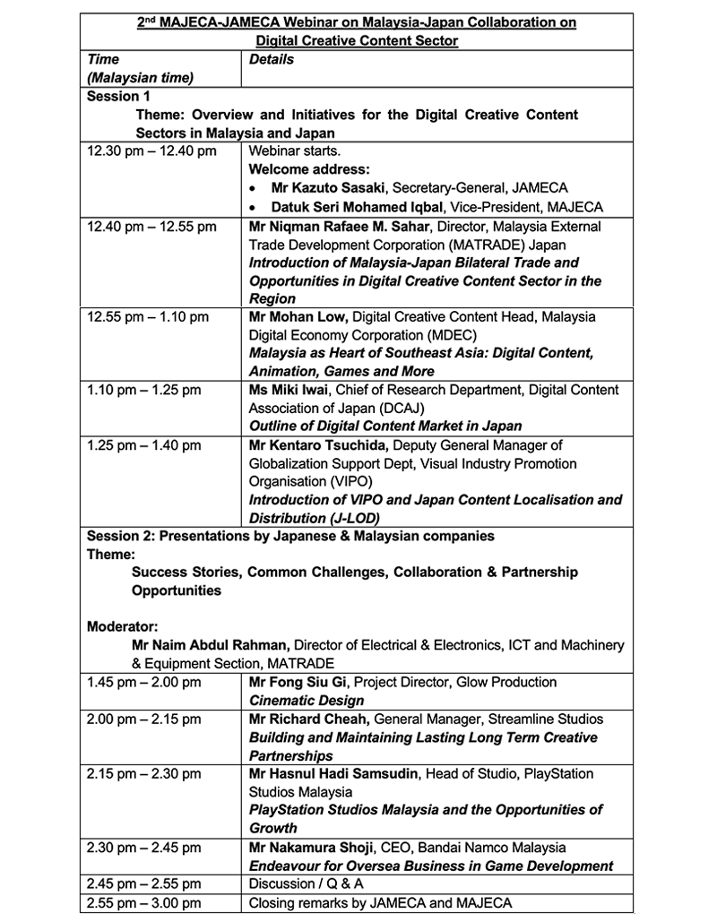 MAJECA would like to place on record our utmost appreciation to our co-organisers JAMECA, MATRADE and MDEC, as well as our supporting organiser DCAJ, VIPO and PIKOM for their efforts in bringing about this successful webinar.